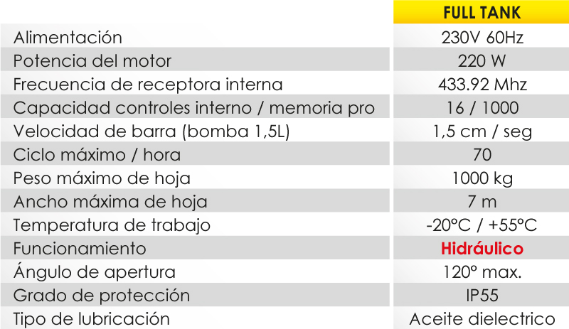Fuerte y silencioso: FULL TANK ha sido planeado de acuerdo con los estándares de silencio, confiabilidad, seguridad anti-aplastamiento otorgada por la válvula de ajuste para la regulación de empuje máximo del sistema, freno hidráulico ajustable en cierre.
