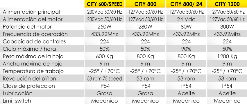 CITY es un operador electromecánico para puertas correderas. La amplia variedad de configuraciones del CITY comprende motores para 230Vac y 110Vac con capacidades de 600, 800 y 1200 kg, y motores de baja tensión (24Vdc) para puertas de hasta 800Kg.