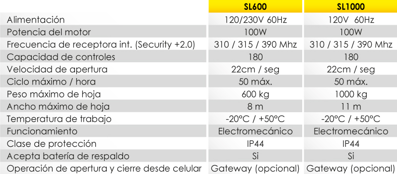 El SL1000 es apto para portones de hasta 2204.62lbs (1000kg) y 36.08ft (11m) de largo.