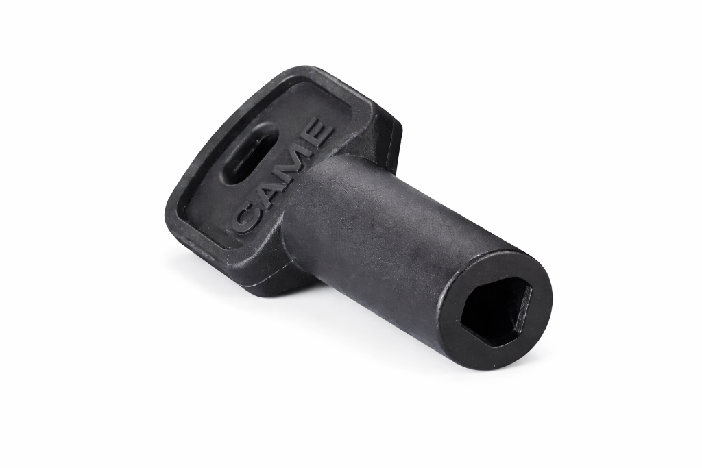 Perfil de conexión (salida hexagonal): compatible con la geometría del cubo de desbloqueo del motor CAME (normalmente hexagonal interior de 8–12 mm)